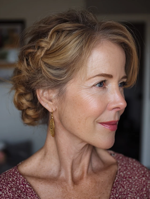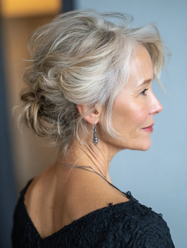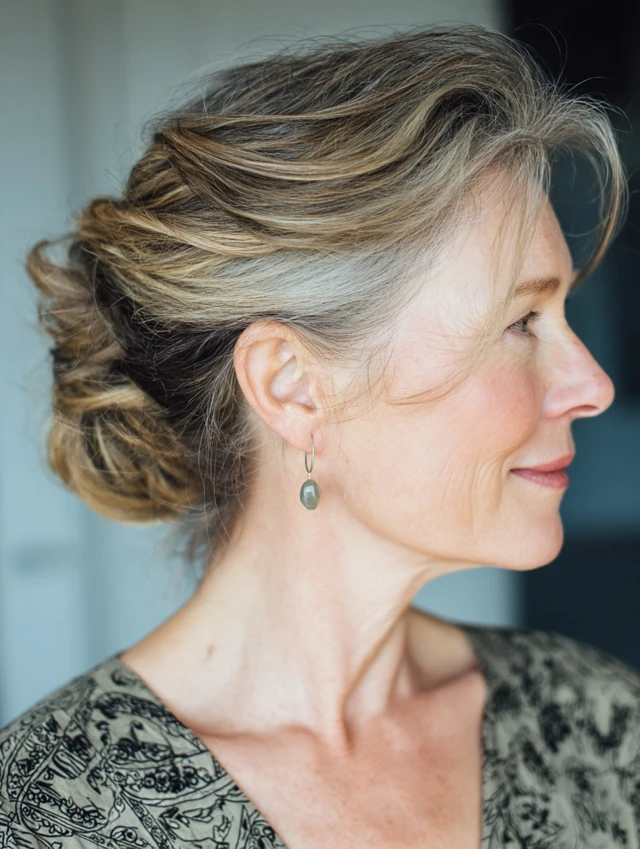 A loose updo looks polished even with air-dried texture and keeps hair comfortable and controlled.