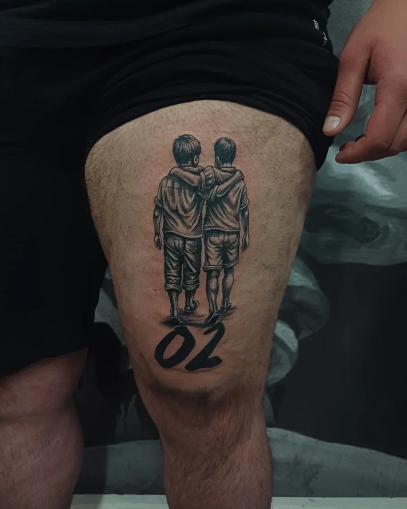Below them, the number “02” is boldly inked. Placed on the thigh, the vertical composition allows for detailed realism. The scene visually represents loyalty, support, and shared journeys, capturing brotherhood through posture, proximity, and natural movement.