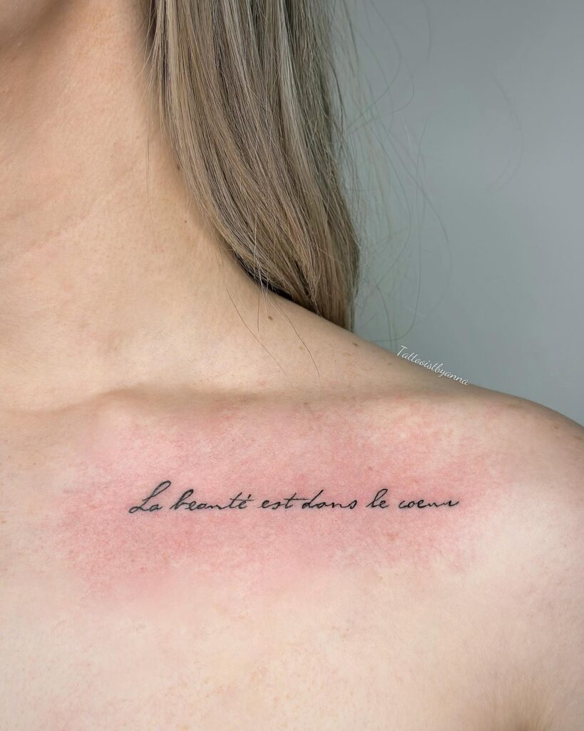 Quote tattoos often serve as daily reminders of values, beliefs, or emotions. Placed along the collarbone, the text feels close to the heart, enhancing its emotional significance. This style suits those who value words as much as visuals in their tattoo choices.