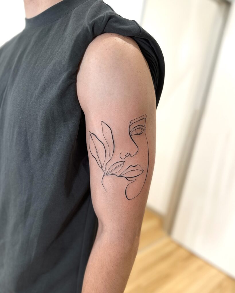 This tattoo combines a minimalist face drawn in one line with leaves that intertwine naturally with facial features. The design feels balanced, with organic shapes softening the geometric simplicity of the face. The line flows smoothly, guiding the eye effortlessly.
