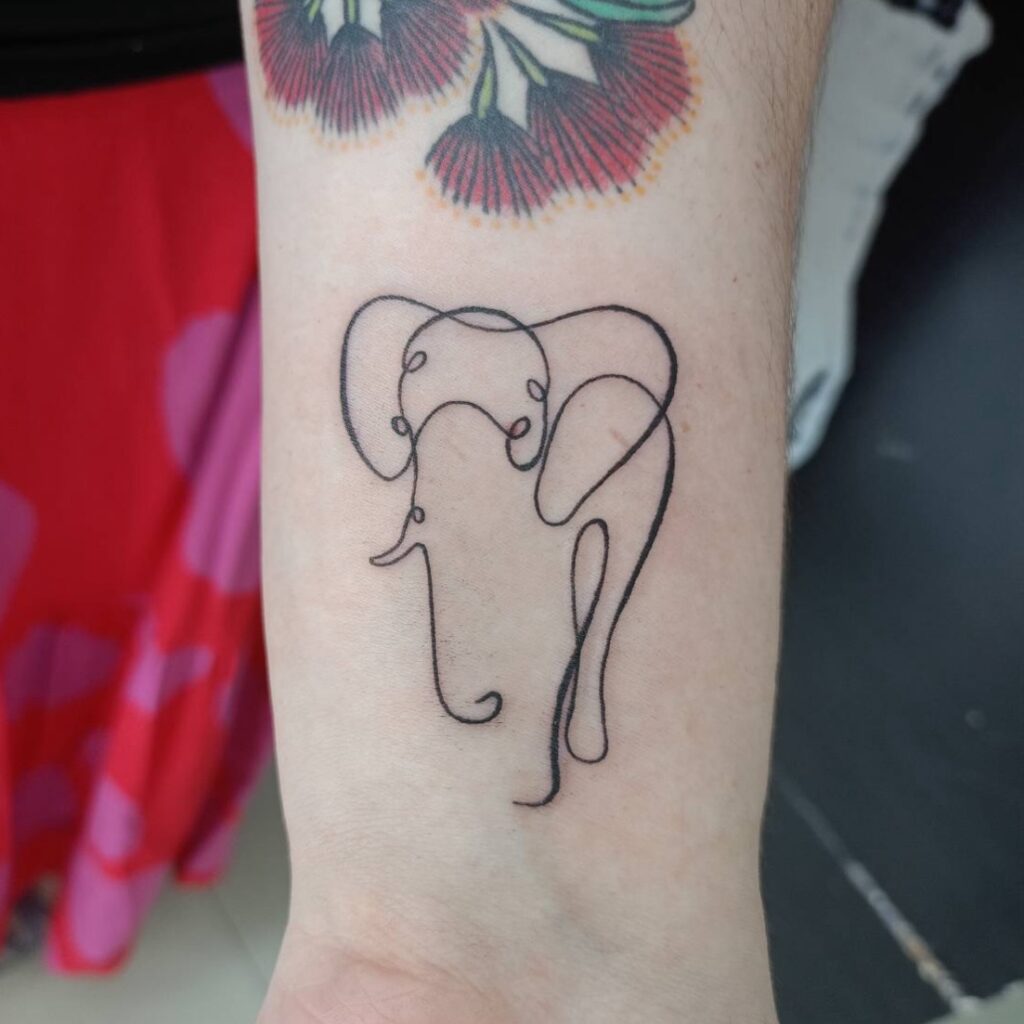 This tattoo presents an abstract elephant formed entirely from one continuous line. The curves suggest the elephant’s head, trunk, and ears without fully defining them, allowing the viewer’s imagination to complete the form. The simplicity gives the piece a modern, artistic edge.
