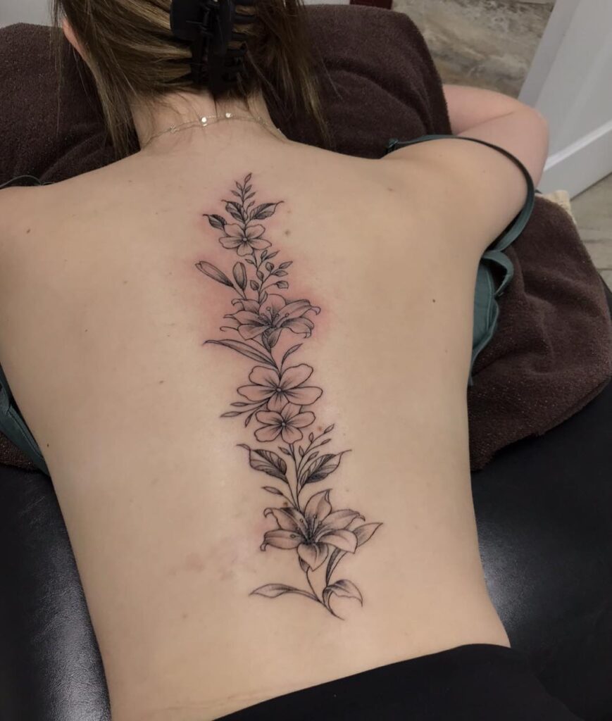 This floral spine tattoo features softly shaded blossoms arranged in a flowing vertical composition. Each flower feels carefully placed, creating a gentle rhythm that follows the natural curve of the back and enhances overall symmetry.