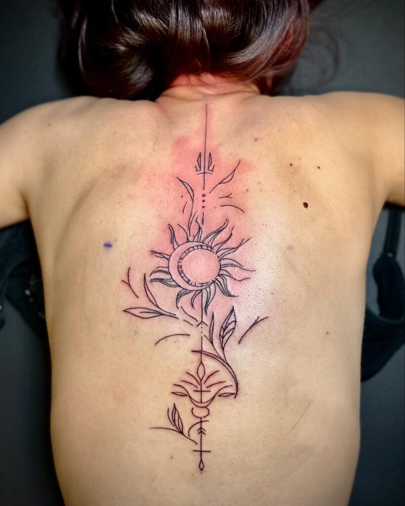 This fine-line spine tattoo showcases a celestial-inspired floral symbol, blending natural and cosmic elements into one cohesive design. The sun-like form radiates softly, while surrounding leaves and lines guide the eye vertically along the back with gentle movement.