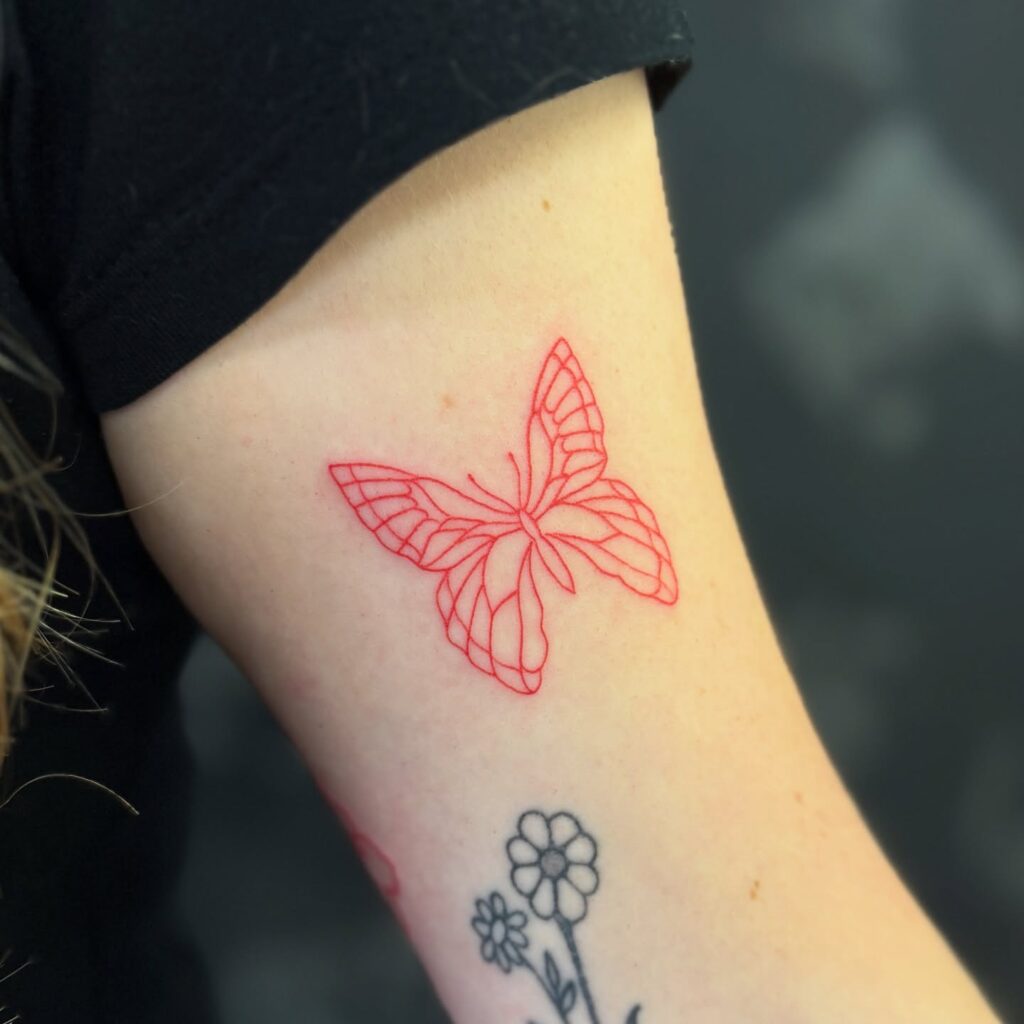This tattoo features a minimalist butterfly drawn entirely with fine red linework, creating a light and airy appearance. The open wings are formed with elegant, flowing lines that emphasize symmetry and softness. The red ink adds a modern, artistic twist while keeping the design subtle and refined. Its placement enhances the feeling of movement and fragility.