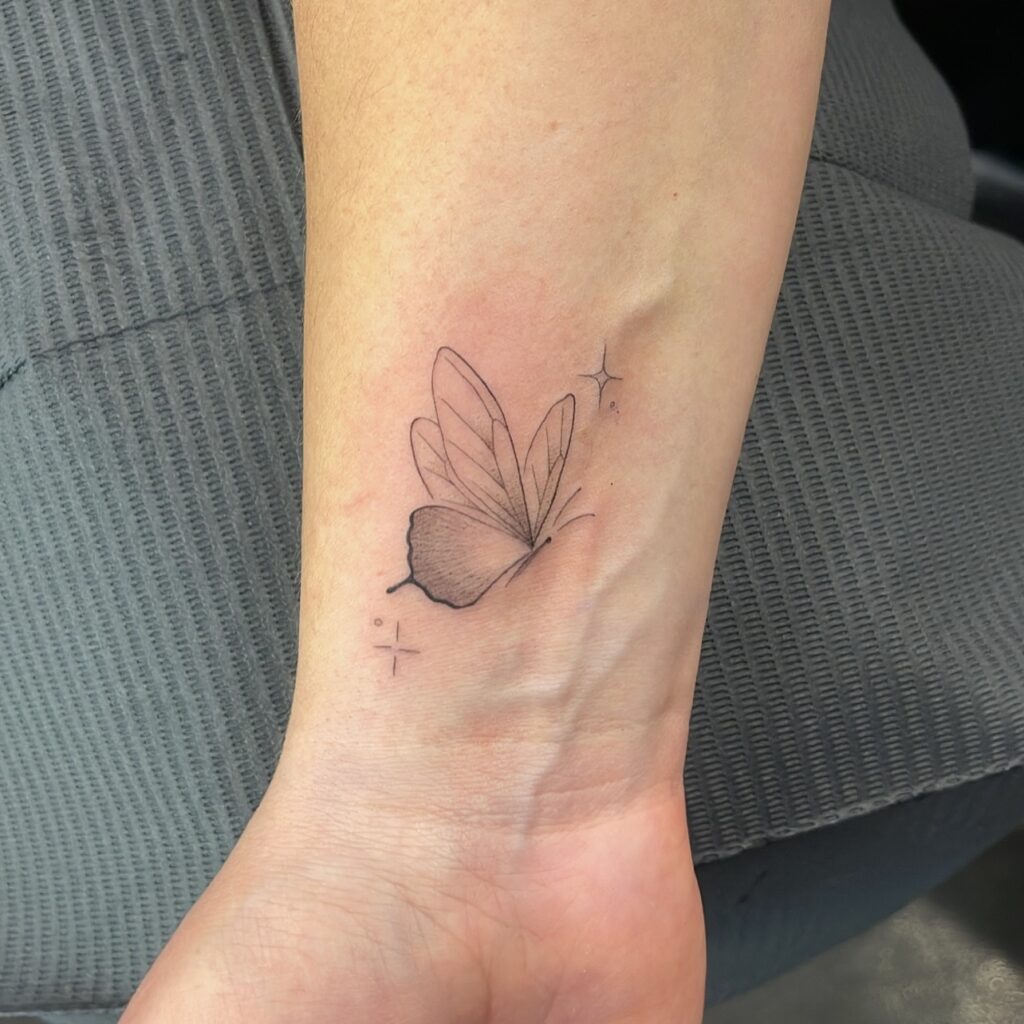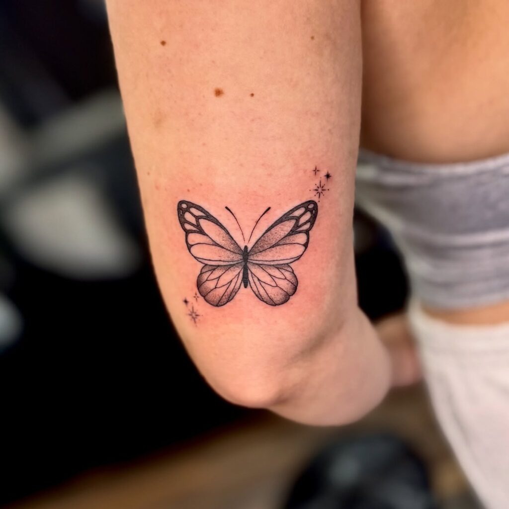 This butterfly tattoo combines soft shading with clean outlines, giving the wings a gentle sense of depth. Small star-like accents surround the butterfly, adding a magical and dreamy quality to the overall design. The balanced composition feels both playful and elegant.