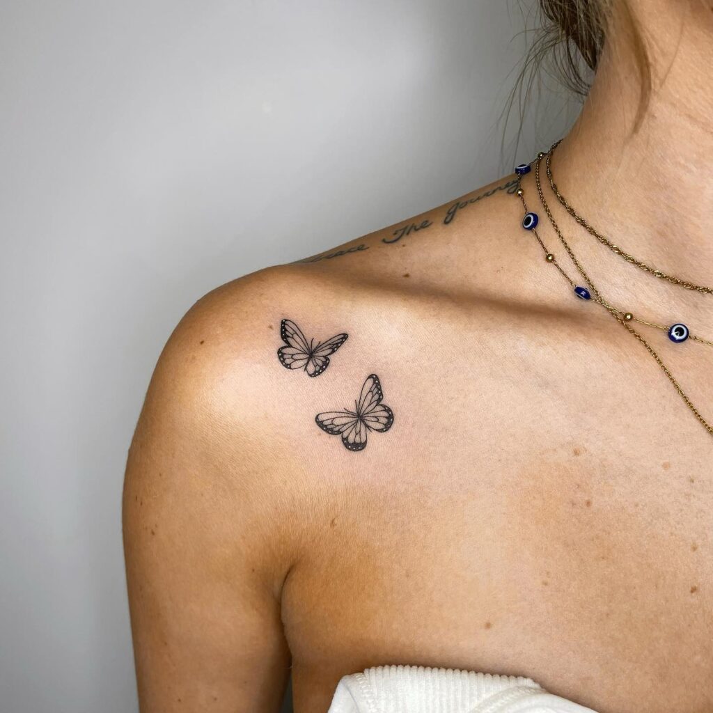 This tattoo displays two finely detailed butterflies resting along the collarbone, enhancing the natural contours of the body. The fine line work and light shading create an elegant, balanced composition. The placement draws attention without feeling overpowering or bold.