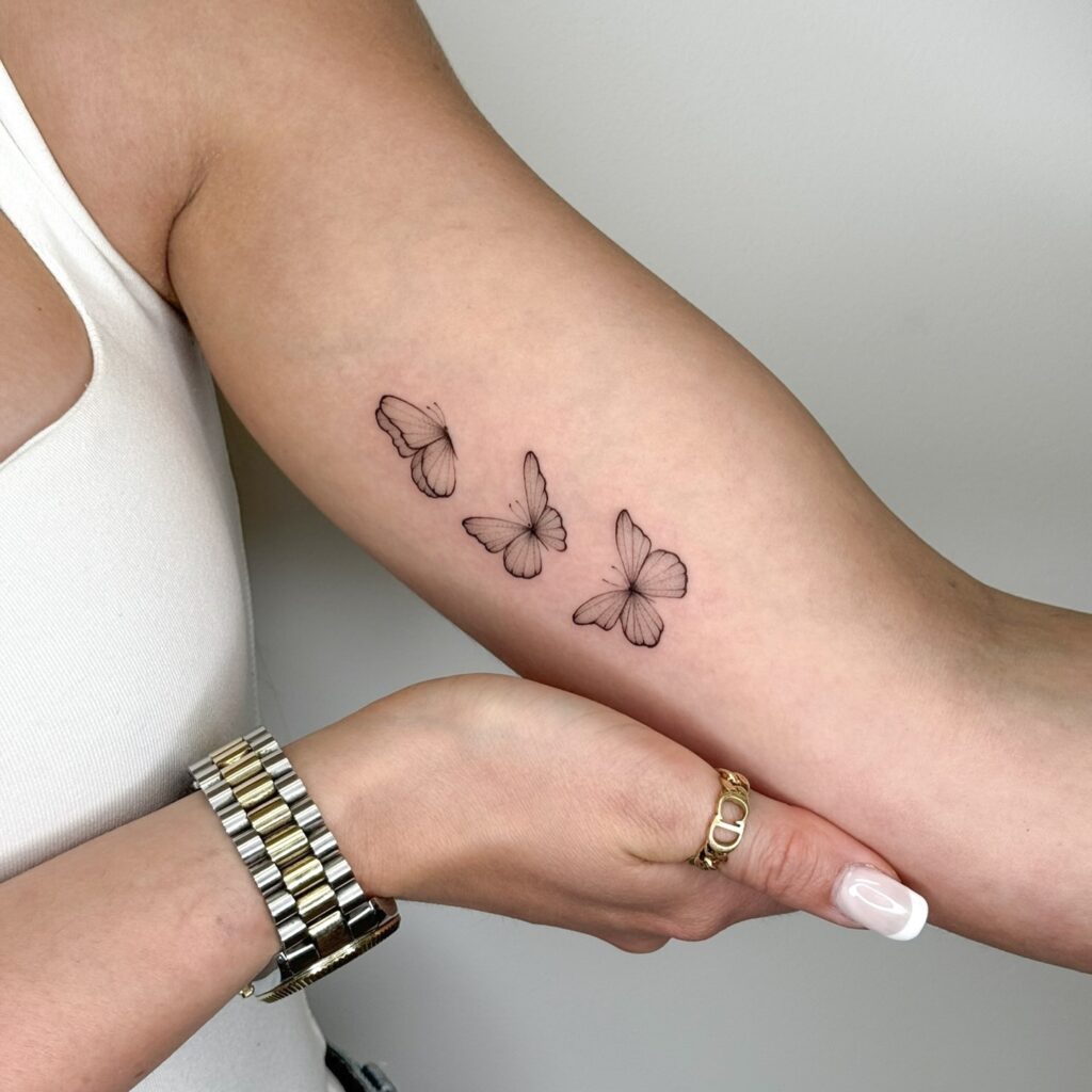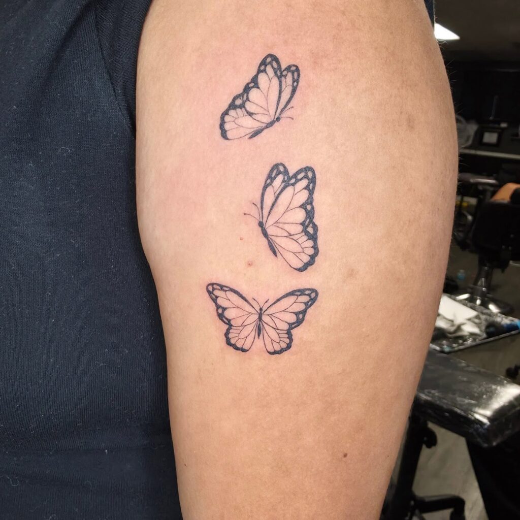 This tattoo shows three butterflies arranged in a gentle horizontal flow, each drawn with thin, graceful lines. The slight variation in wing angles creates a sense of movement, as if the butterflies are drifting together naturally. The design feels cohesive and airy.