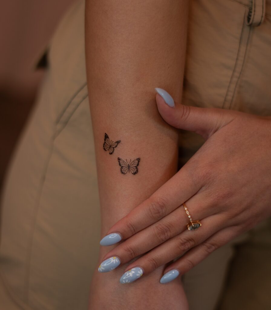 This tattoo features two small butterflies placed close together, drawn with fine black linework. The simple outlines and minimal details keep the design clean and modern. Their positioning suggests harmony and connection, giving the tattoo a soft emotional undertone.