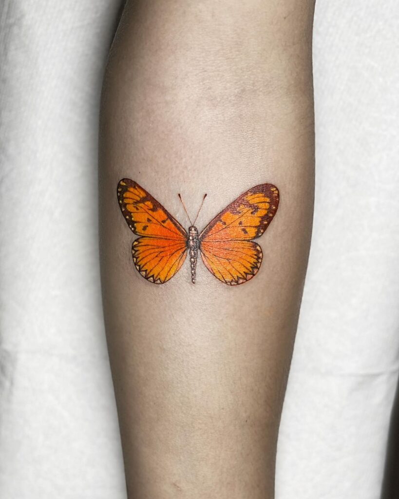 This butterfly tattoo stands out for its lifelike realism, featuring warm orange tones and carefully shaded wings. The detailing mimics natural patterns, giving the illusion of a real butterfly resting gently on the skin. Subtle gradients and highlights add depth, making the tattoo visually striking without appearing heavy.