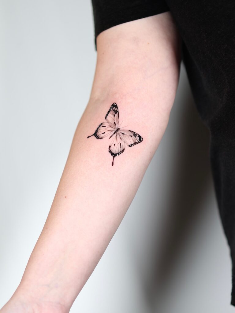 This tattoo features a single butterfly drawn with precise fine lines and light dot detailing. The wings appear delicate and symmetrical, giving the design a calm and refined presence. Its placement on the forearm makes it visible yet tasteful.