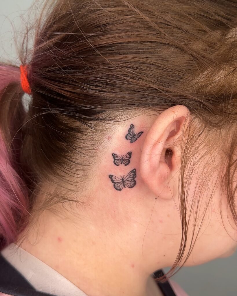 4. Behind-the-Ear Butterfly Trio Tattoo
