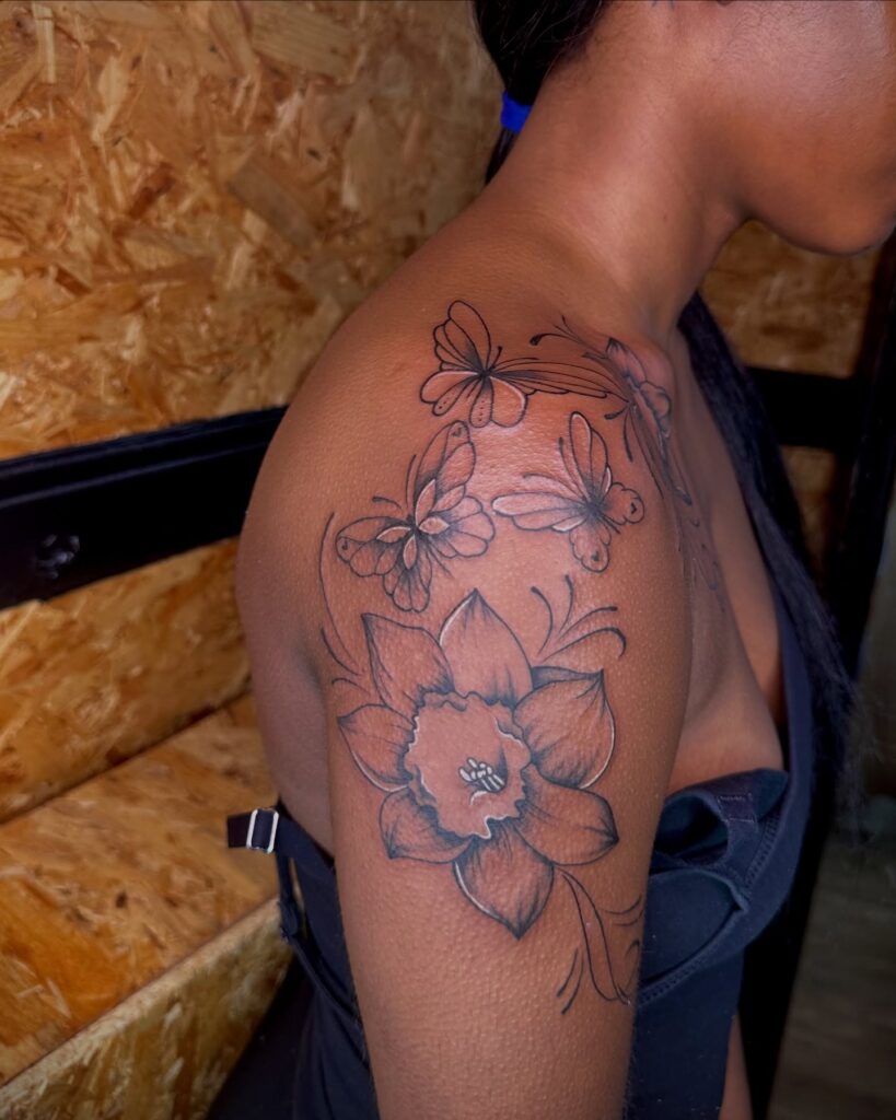 This elegant shoulder tattoo features flowing botanical elements intertwined with delicate butterflies. The fine line technique and soft shading create a light, airy appearance that complements the skin beautifully. Each flower is carefully detailed, while the butterflies add motion and a sense of freedom to the composition.