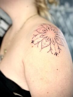 A small, understated floral branch rests delicately along the collarbone, emphasizing simplicity and balance. The fine lines and minimal detailing create a clean, modern look that complements the natural contours of the shoulder. Its size makes it discreet, yet its placement keeps it visually striking.