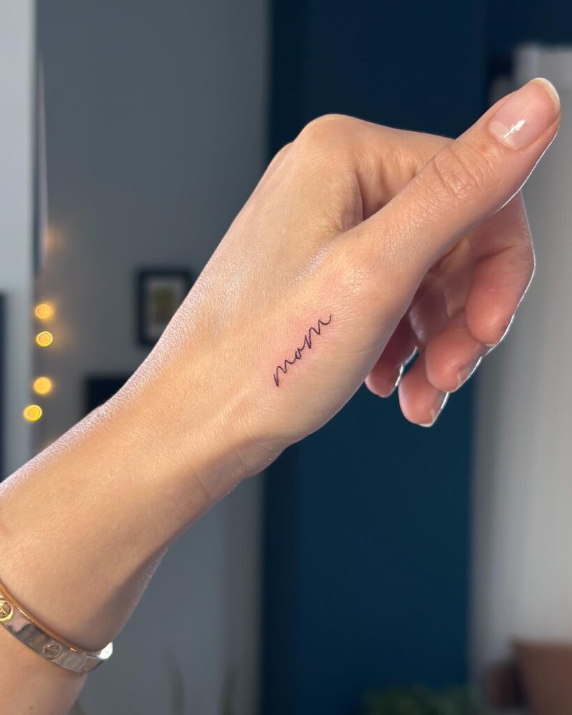 This small wrist tattoo features the word “mom” written in simple lowercase script with a small heart attached. Beneath it, a numeric date is inked in clean black text. The minimalist design uses fine lines and no shading, keeping the tattoo subtle and intimate.