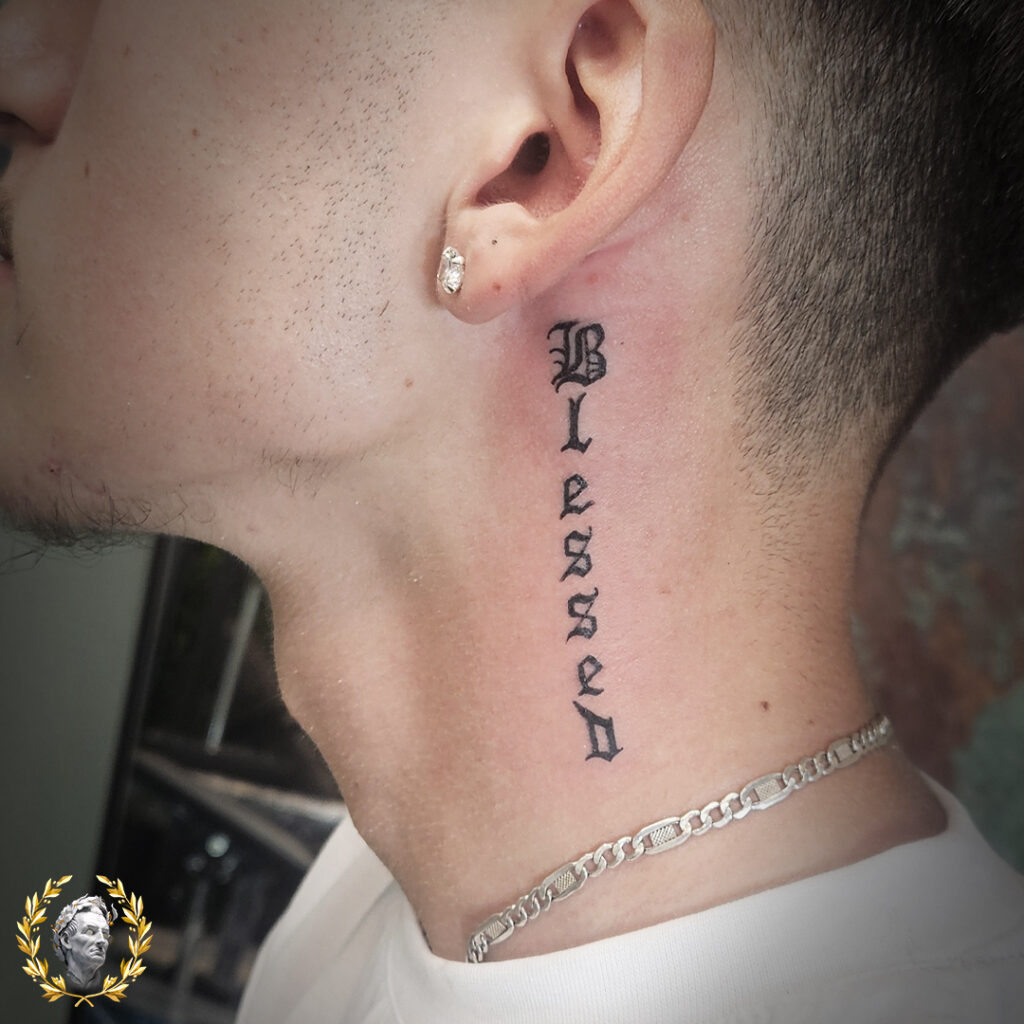 4. One-Word Vertical Neck Tattoo in Gothic Script