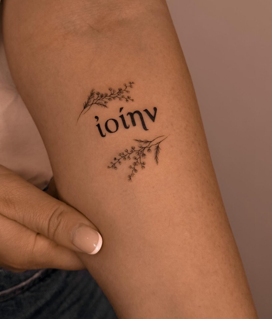 This tattoo presents the word “Íoinv” framed by delicate botanical elements. The fine line leaves soften the typography, creating a harmonious blend of nature and text that feels organic and gentle on the skin.