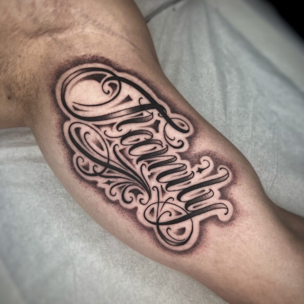 The surrounding shadows and curves add depth, giving the tattoo a sculptural quality. This design is perfect for those who want their one-word tattoo to feel rich in detail and meaning, celebrating connection, heritage, and unconditional bonds through expressive typography.
