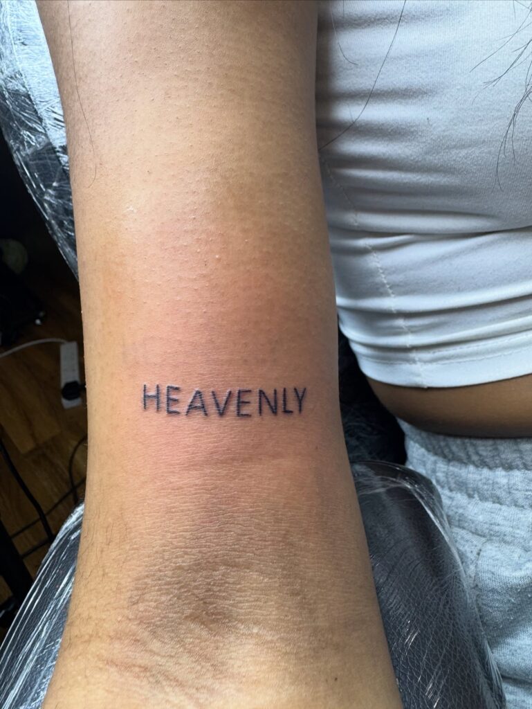 This tattoo displays the word “Heavenly” in simple, evenly spaced lettering on the inner arm. The clean font choice and balanced placement create a calm, refined look that feels gentle and intentional.