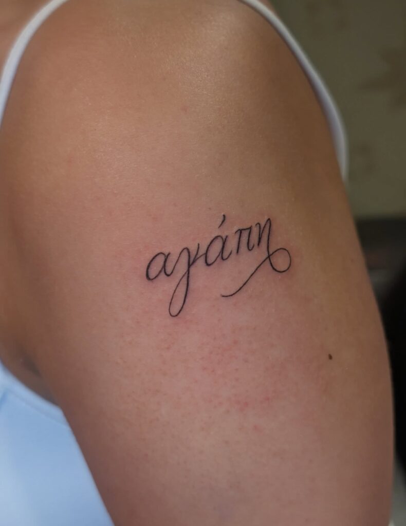 This tattoo features the word “Aján” inked in a refined cursive script on the upper arm. The flowing lines and gentle curves give it a timeless, handwritten feel, making the design both personal and graceful. Its placement allows the tattoo to stand out subtly while still remaining intimate and close to the wearer.