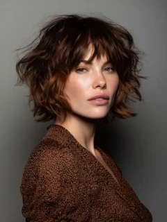 Curly bangs add personality and soften the look while drawing attention to the eyes.