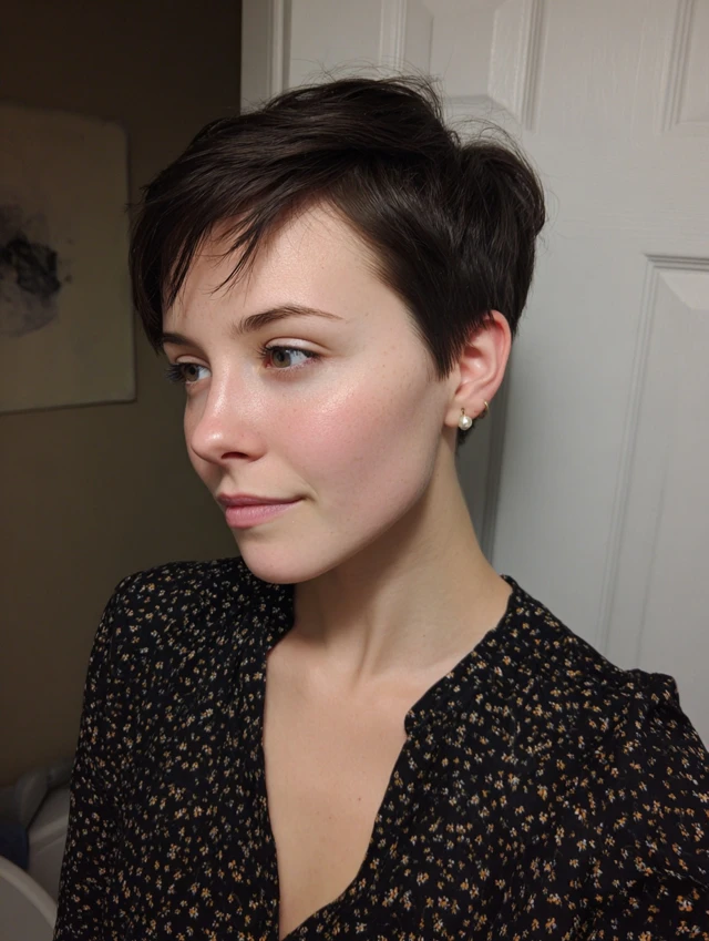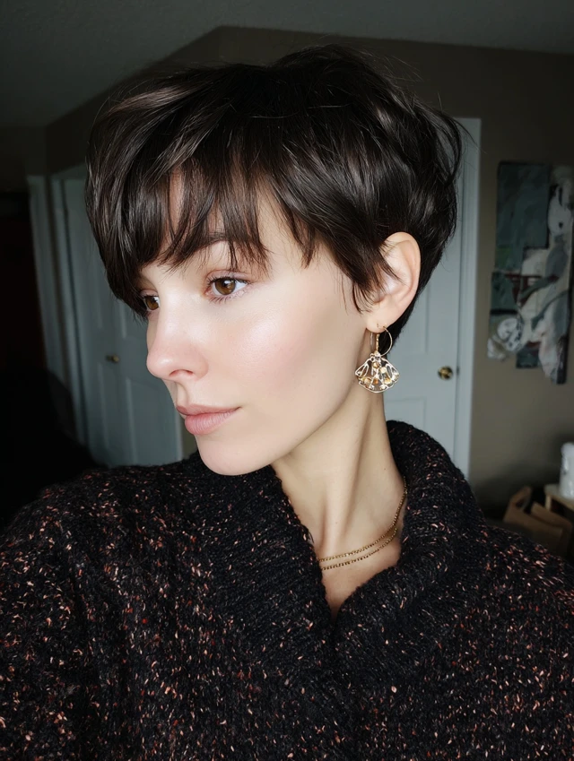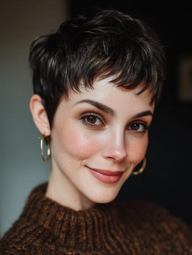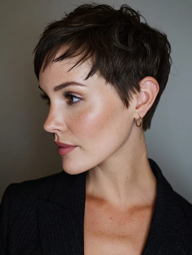 A well-cut pixie highlights bone structure and confidence, embodying refined simplicity.