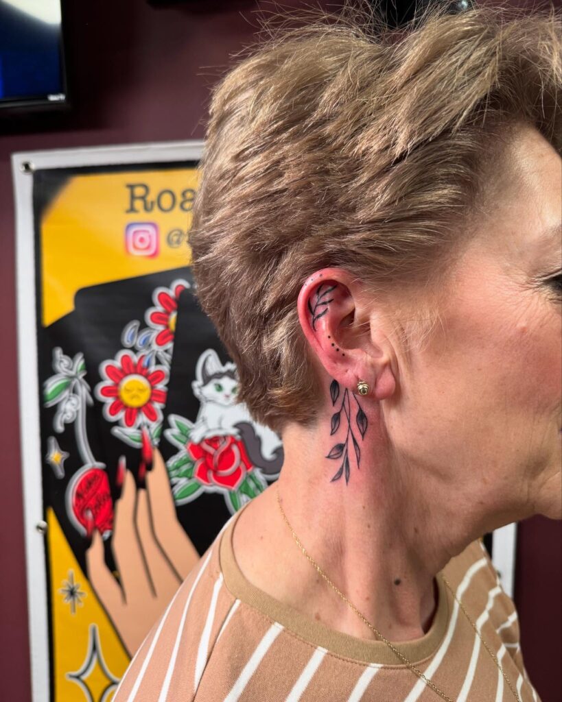 This elegant tattoo showcases fine-line botanical elements flowing from behind the ear down the neck. Slender leaves and dotted accents create a graceful vertical movement that complements the natural curve of the jaw and neck. The black ink remains soft and airy, enhancing the tattoo’s femininity and refined aesthetic.