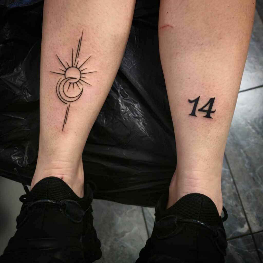 This calf tattoo combines an abstract sun and crescent moon motif with bold linear elements, paired with the number fourteen on the opposite leg. The contrast between symbolic imagery and numeric detail creates a modern, personal narrative that feels intentional and unique.