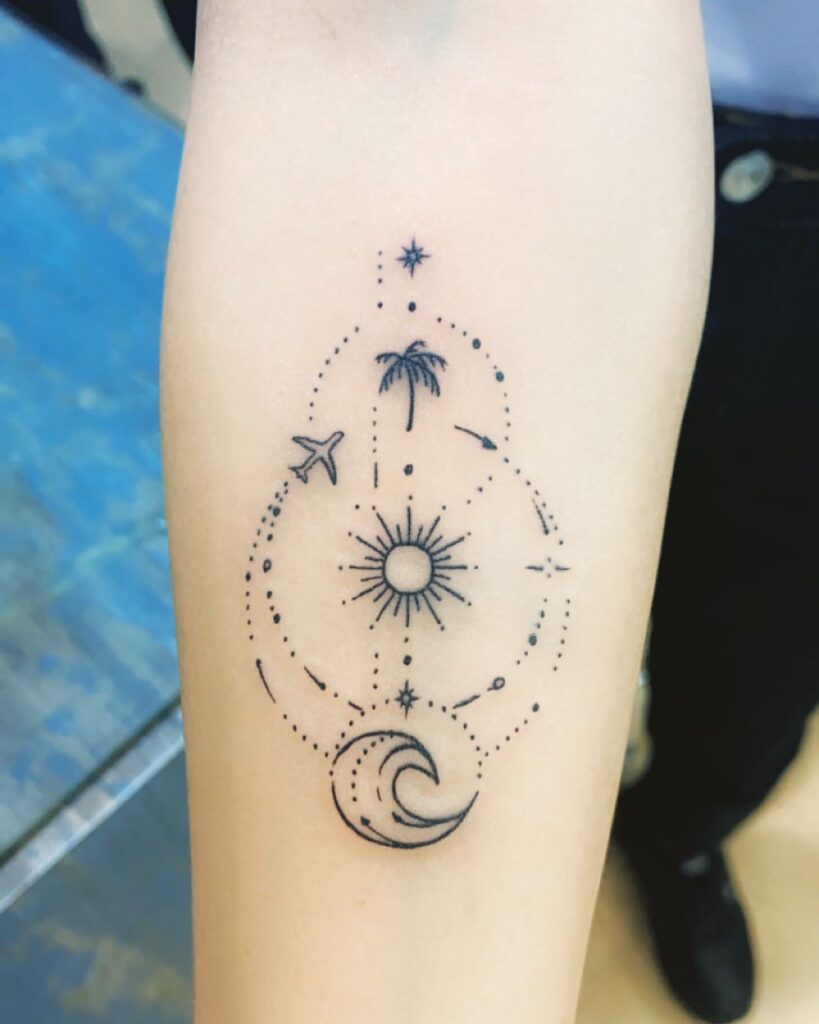 This minimalist forearm tattoo combines celestial symbolism with travel-inspired imagery, creating a poetic visual story. Fine dotted lines form orbital paths linking the sun, moon, stars, airplane, and palm tree, suggesting movement, exploration, and life’s cyclical rhythm. The delicate black ink and precise spacing give the design a light, almost meditative quality that feels intentional and balanced.