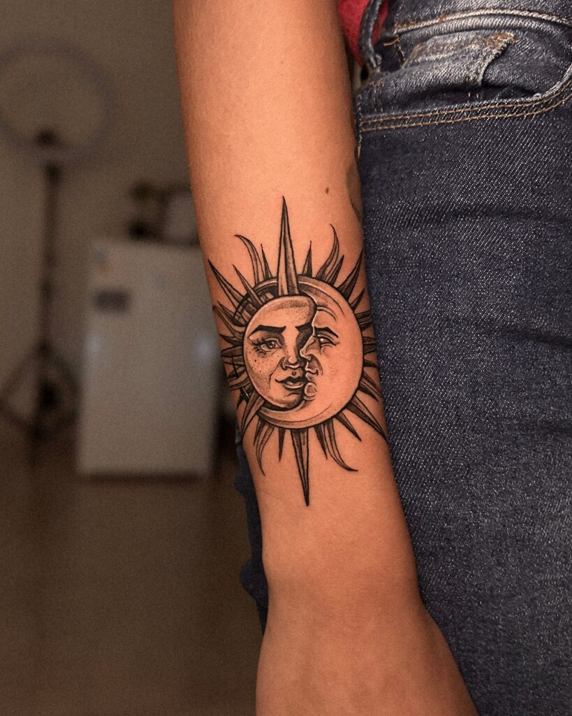 This detailed forearm tattoo showcases a realistic fusion of the sun and moon, each with expressive facial features. Bold shading and strong contrast give the piece depth and presence, making it a standout design compared to minimalist styles.