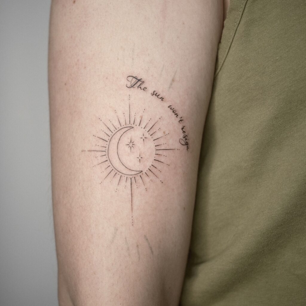 This elegant arm tattoo pairs a crescent moon with fine radiating lines and a handwritten script that reads “The sun won’t resign.” The combination of text and imagery adds emotional depth, blending celestial symbolism with personal affirmation. The minimalist shading keeps the design soft and introspective.