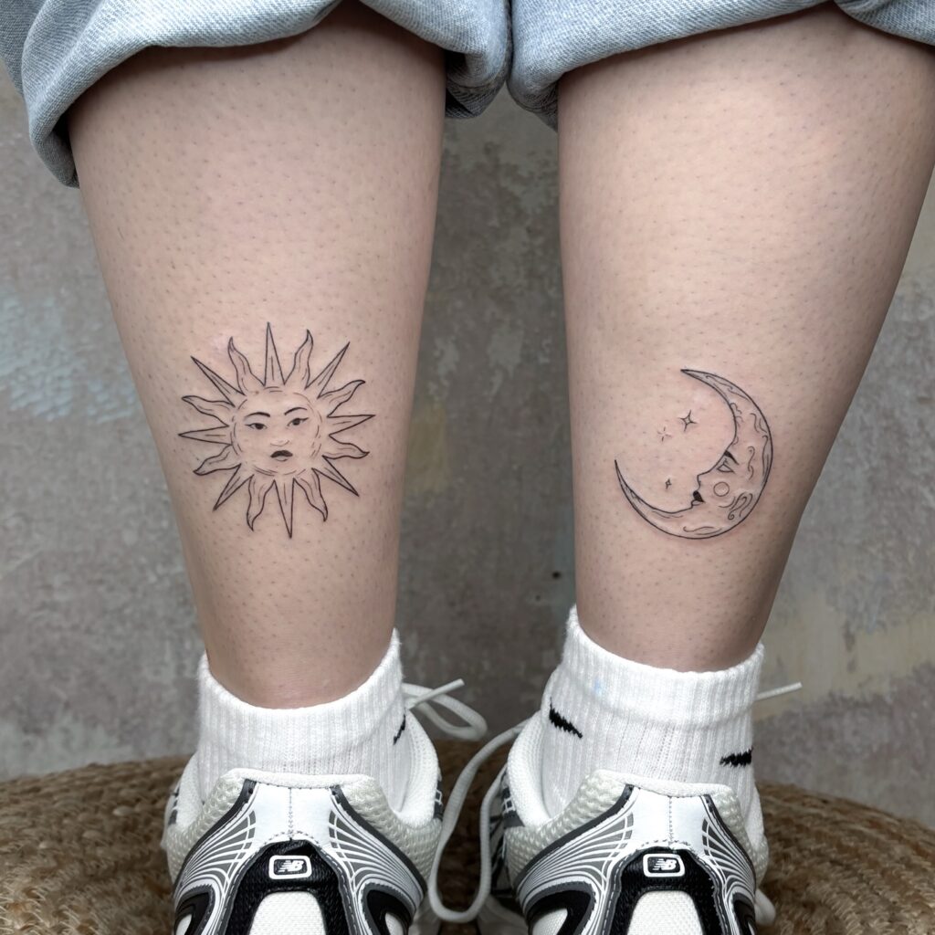 This paired calf tattoo features a stylized sun on one leg and a crescent moon on the other, creating visual harmony through balance and symmetry. The linework is clean and illustrative, with subtle facial expressions that give both celestial bodies a calm, almost human presence. Together, they represent duality, light and dark, and emotional equilibrium.