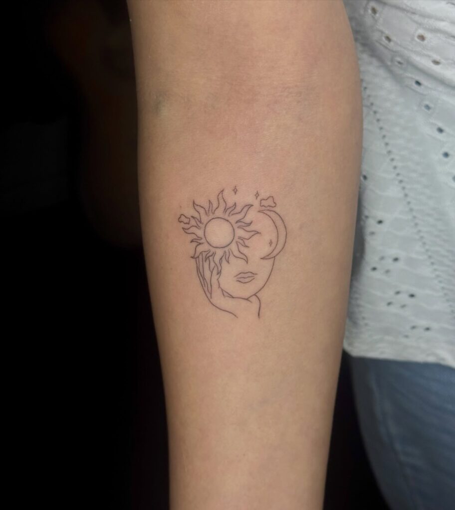 This delicate forearm tattoo portrays a serene feminine face intertwined with a sun and crescent moon. Fine lines and minimal shading create a soft, artistic look that feels both celestial and human. The composition suggests intuition, inner peace, and emotional depth.