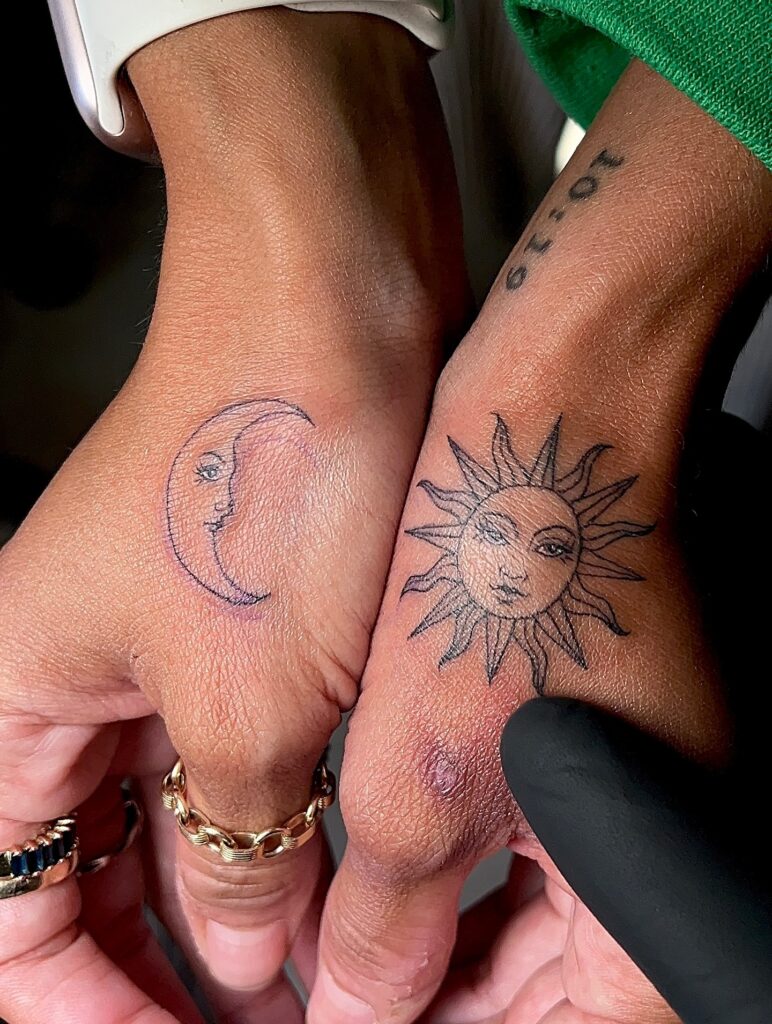 These small hand tattoos showcase a delicate crescent moon on one hand and a radiant sun on the other. The fine-line execution keeps the design subtle while still expressive, allowing the symbolism to shine without overpowering the skin. Their placement emphasizes connection, especially when the hands come together.