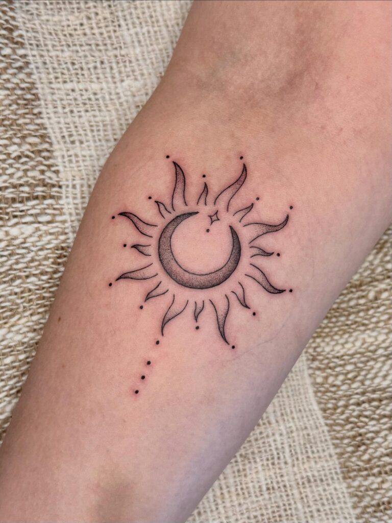 The design blends lunar calm with solar energy, symbolizing transformation, protection, and balance. The dotted details add a mystical touch, enhancing its spiritual feel. Ideal for those drawn to celestial themes with artistic flair, this tattoo balances elegance, symbolism, and visual flow beautifully.