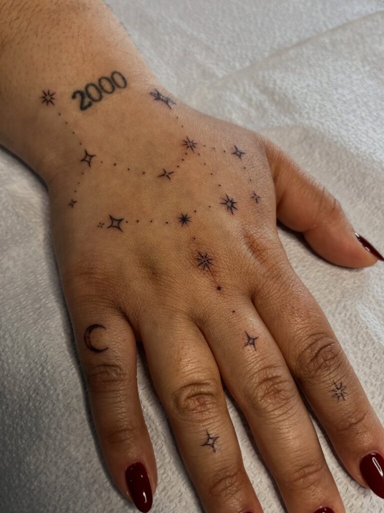 This hand tattoo scatters tiny stars and dotted lines across the skin, forming a constellation-like pattern that feels organic and free. A small crescent moon and the number “2000” add personal significance, anchoring the celestial elements to a specific moment in time. The light touch keeps the design elegant despite its bold placement.