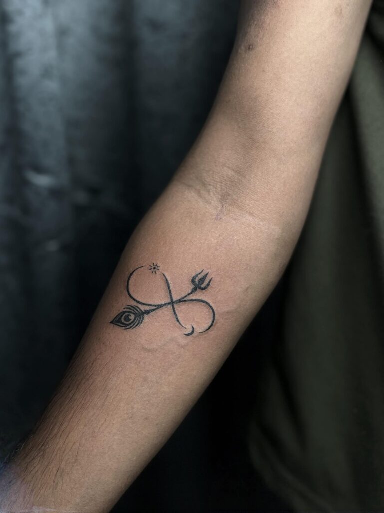 This tattoo combines an infinity symbol with a trident and third-eye detail, blending spirituality with strength. The design represents eternal energy, divine protection, and inner awareness.