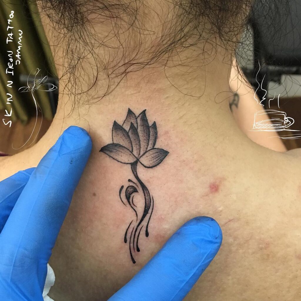 3. Lotus Linework – Neck Spiritual Tattoo