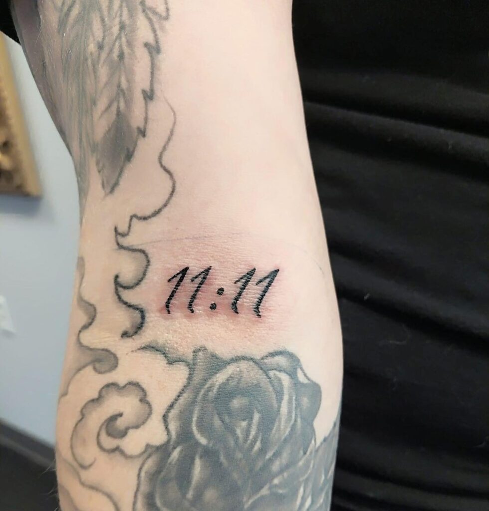 The number “11:11” is tattooed in bold yet simple numerals on the wrist, symbolizing alignment, intuition, and spiritual awakening. Angel numbers like this are often associated with synchronicity and higher guidance.