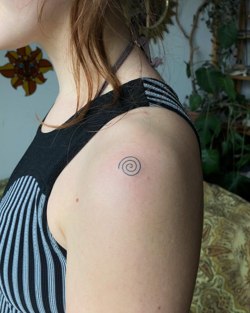 A small spiral tattoo sits gently on the upper arm, drawn with a single continuous line. The spiral is a timeless spiritual symbol, often associated with growth, cycles, and the flow of energy.