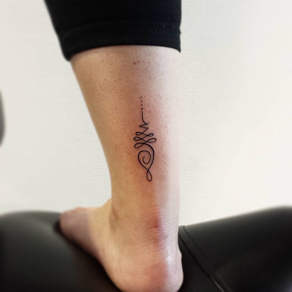 This ankle tattoo features an abstract sacred symbol composed of flowing loops and dots. The vertical alignment adds elegance, while the fine lines keep the design light and intentional.