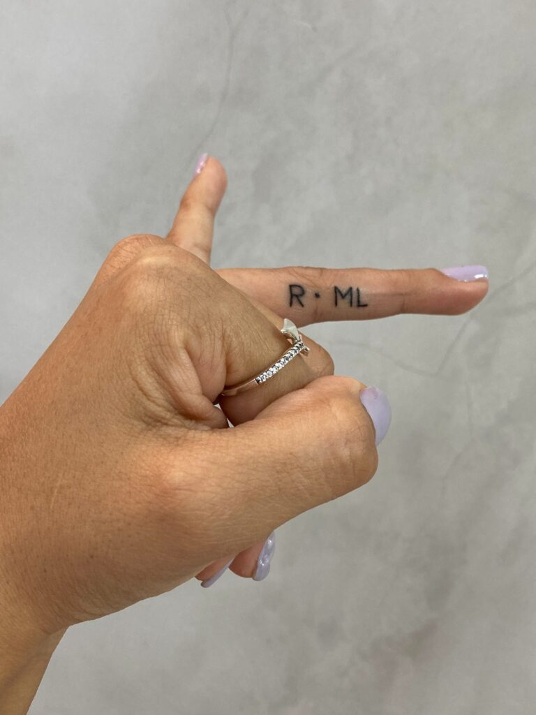 This tattoo features the initials “R·ML” delicately inked along the side of the finger. The compact lettering and clean black ink make it subtle yet deeply personal, ideal for a discreet symbol of identity, love, or connection.