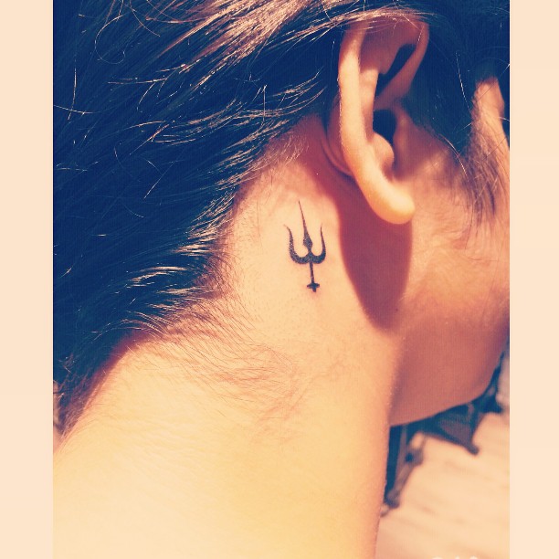 A small trident tattoo is placed just behind the ear, referencing strength, protection, and divine power. The simple silhouette keeps the symbol instantly recognizable yet understated.