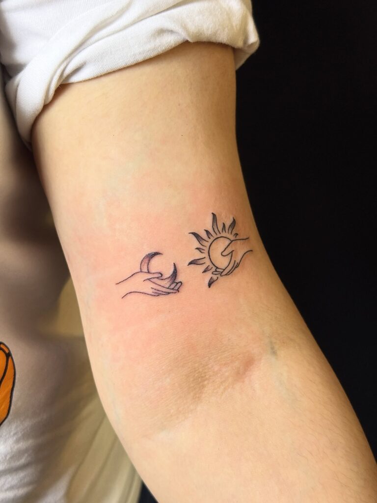 This paired tattoo shows the sun and moon resting in gentle hands, symbolizing balance, duality, and harmony between opposing forces. The fine line style keeps the imagery soft and contemplative.