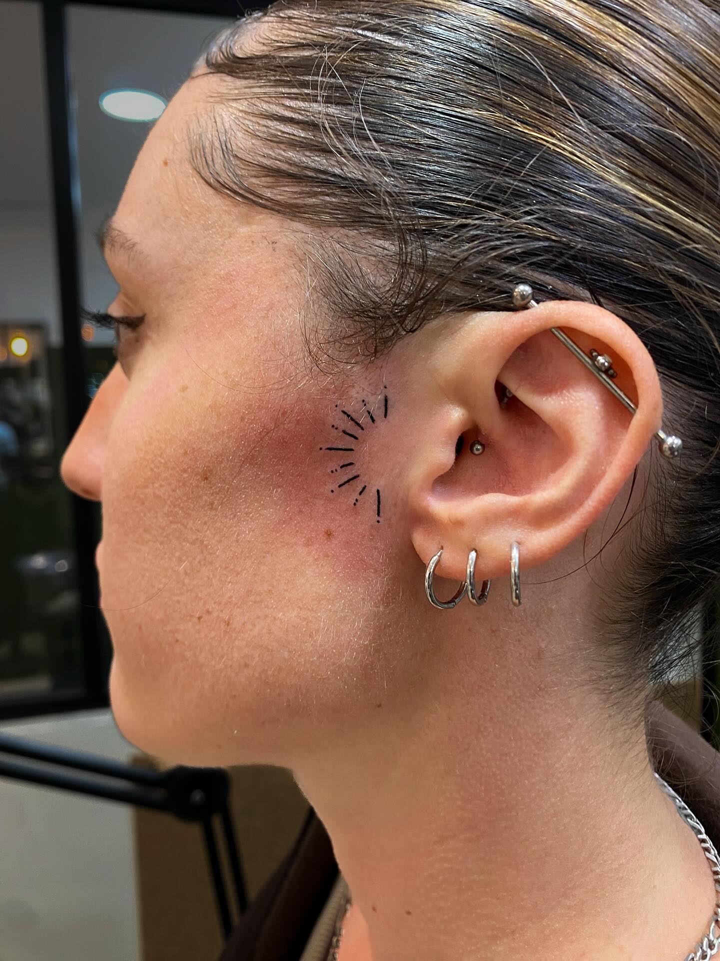 This minimalist tattoo features short radiating lines near the ear, resembling light rays or energetic pulses. The abstract design suggests awareness, intuition, and inner illumination.