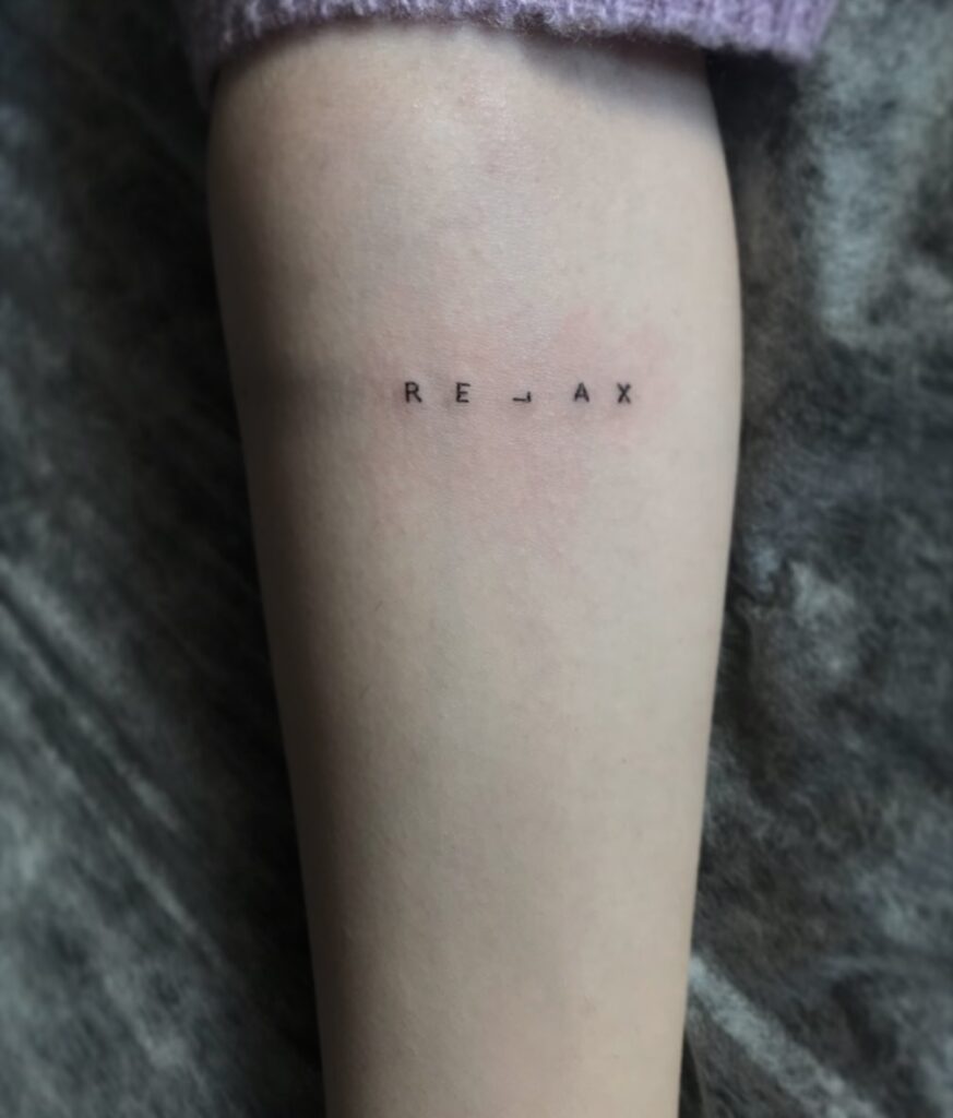 This minimalist tattoo spells “RELAX” in spaced-out capital letters, creating a clean and modern look. The generous spacing between letters adds visual calm, reinforcing the message itself. Its subtle placement and light ink keep the design soothing rather than bold.