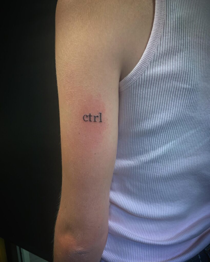 This tattoo showcases the word “ctrl” in a clean, typewriter-style font, placed neatly on the upper arm. Its stark simplicity mirrors its digital inspiration, drawing from keyboard language to convey a modern, understated aesthetic. The redness around the ink suggests freshness, emphasizing the immediacy and intention behind the design.