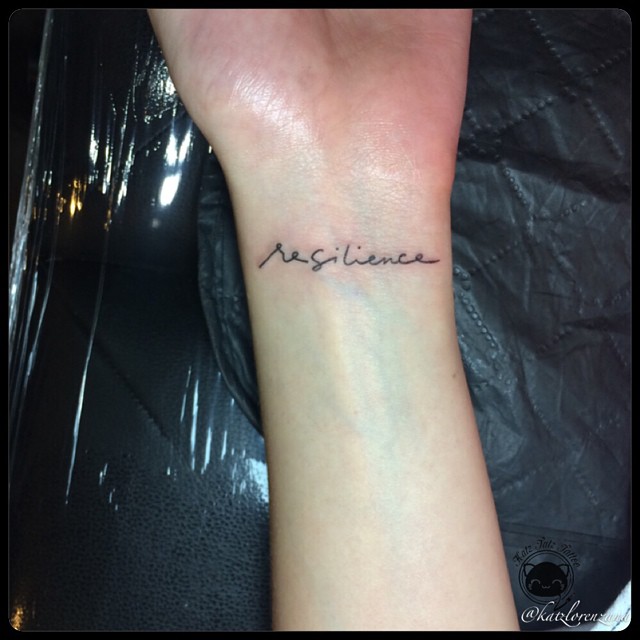 This delicate wrist tattoo features the word “resilience” written in a fine, flowing script that feels both personal and understated. Its placement on the inner wrist makes it an intimate reminder, visible mostly to the wearer. The thin linework and subtle spacing give it an almost handwritten quality, emphasizing vulnerability and quiet strength rather than bold declaration.