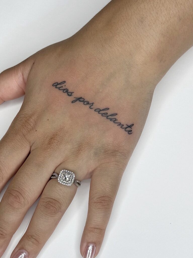 This hand tattoo displays the phrase “Dios por delante” in a soft, cursive script, placed delicately across the skin. The lettering flows naturally, complementing the hand’s contours while remaining refined and readable. Its modest size keeps the design elegant rather than overpowering.
