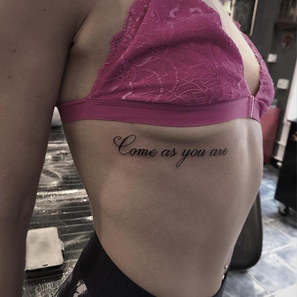 Positioned gracefully along the ribcage, this script tattoo reads “Come as you are” in elegant, flowing cursive. The placement follows the natural curve of the body, enhancing the softness and intimacy of the message. The refined lettering keeps the design light and unobtrusive while still emotionally impactful.