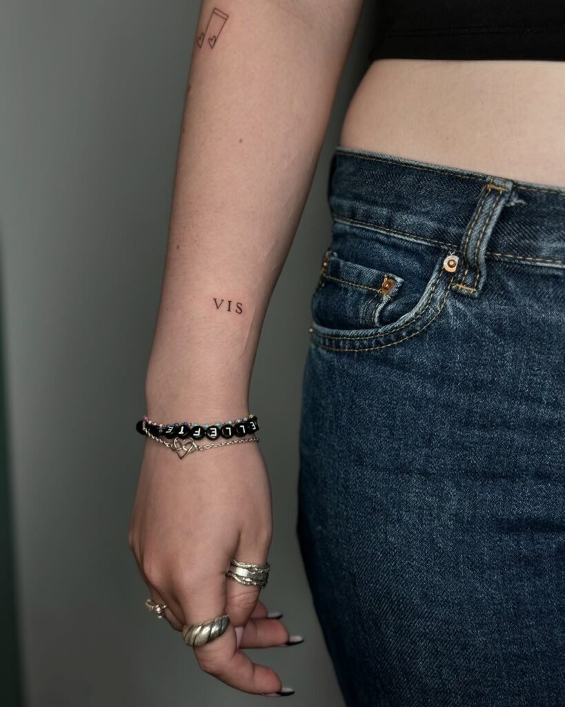 This minimalist tattoo simply reads “VIS” in a small, clean serif font on the inner forearm. The restrained typography and precise spacing give it a refined, almost academic feel. Its subtle size ensures the tattoo feels personal, as though it holds meaning known primarily to the wearer.
